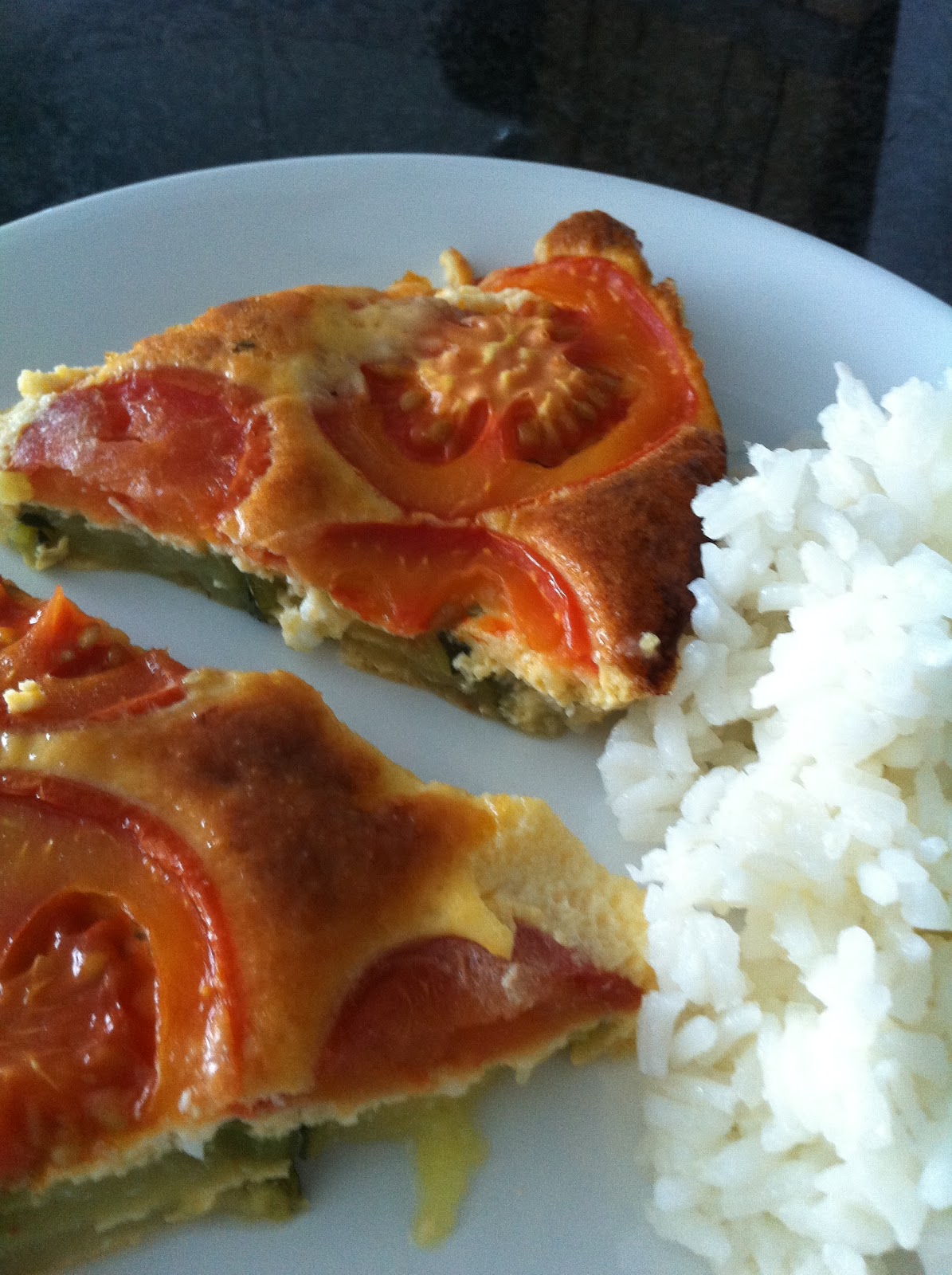 levar ao lume 1 colher de sopa de azeite e a cebola. juntar a courgete cortada em rodelas de 0,5 cm. deixar cozinhar tapado até a cougete amolecer, cerca de 10 minutos. deixar cozinhar mais 2 ou 3 minutos destapado. juntar o tomilho e temperar com sal e pimenta. juntar os ovos mexidos com queijo ralado. o queijo pode ser parmesão, ou outro de que se goste. cobrir com rodelas de tomate. deixar cozinhar 10 minutos. levar a forno quente durante 15 minutos ou até estar cozinhado. servir com arroz (opcional) e salada.
